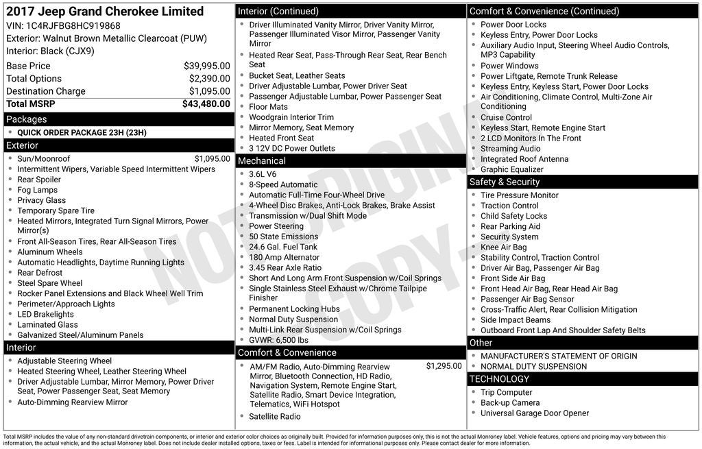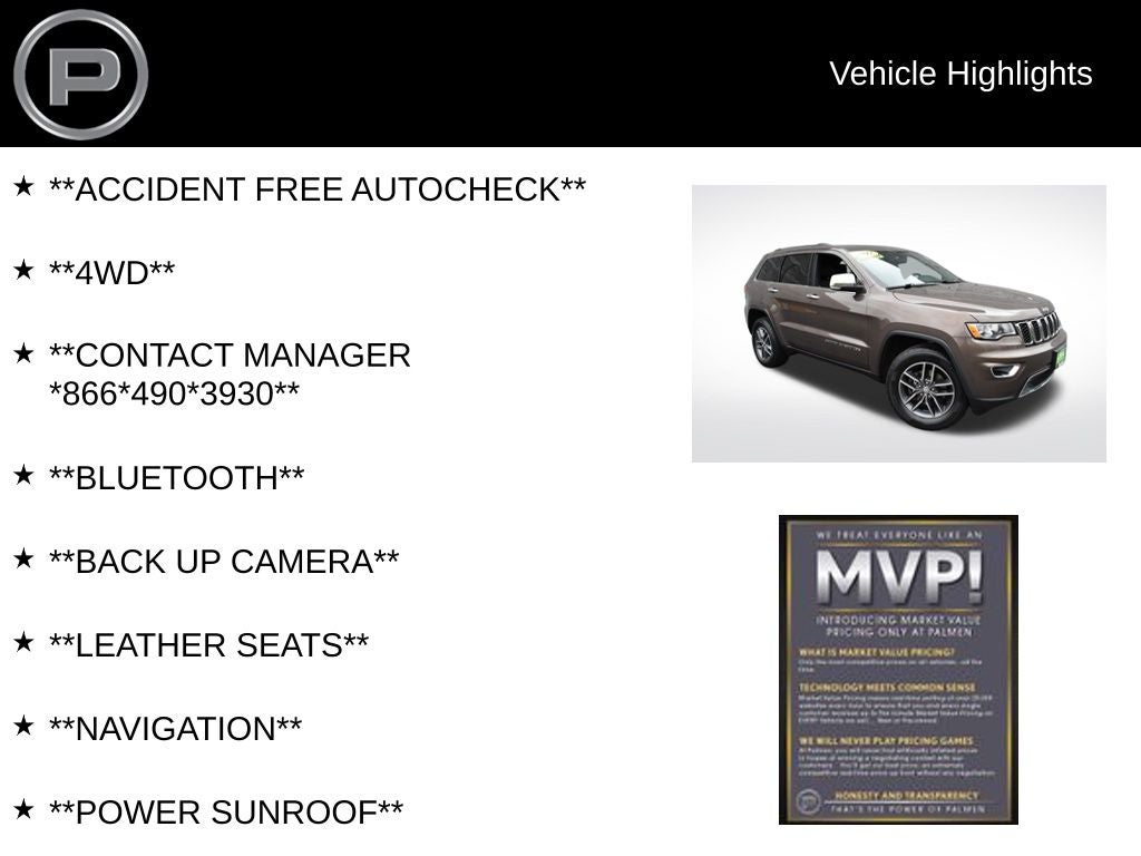 Drive luxury and capability with this 2017 Jeep Grand Cherokee Limited 4x4, a premium SUV built for comfort and all-season performance across Southeast Wisconsin and Northern Illinois. Powered by a V6 engine with advanced 4x4 capability, this Grand Cherokee delivers smooth power and confident handling. Features include Uconnect 8.4 navigation system, power sunroof, ParkView backup camera, ParkSense rear parking sensors, premium interior with power front seats, and spacious cargo versatility—perfect for commuting or weekend adventures.
