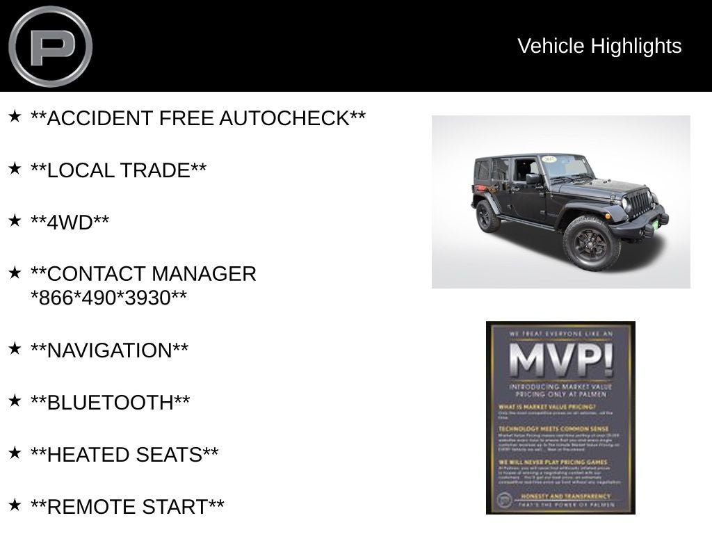 Get ready for year-round adventure in this 2017 Jeep Wrangler Unlimited Winter 4x4, now available at Palmen Kia and Palmen Motors in Kenosha, Wisconsin. Finished in classic Black Clearcoat with a black interior, this Wrangler is built to handle Midwest winters and off-road fun with confidence.
