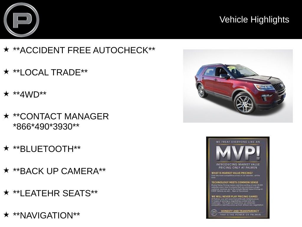 At Palmen Kia and Palmen Motors, we make upgrading simple with financing available and top-dollar trade-in offers. Visit us today in Kenosha, WI, and take this stylish, high-performance Ford Explorer Sport for a test drive serving drivers from Zion, Gurnee, and Lake Geneva.
