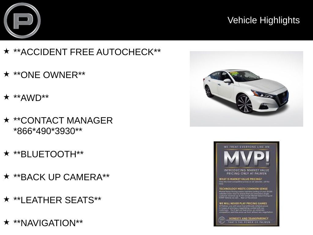 Powered by a 2.5L DOHC 4-cylinder engine with Intelligent All-Wheel Drive, the Altima offers excellent performance and fuel efficiency with 25 MPG city / 35 MPG highway. Safety is a priority with advanced features like Intelligent Forward Collision Warning with Automatic Emergency Braking, Blind Spot Warning, Rear Automatic Braking, Lane Departure Alert, Front and Rear Parking Sensors, and an Aerial View Camera System.