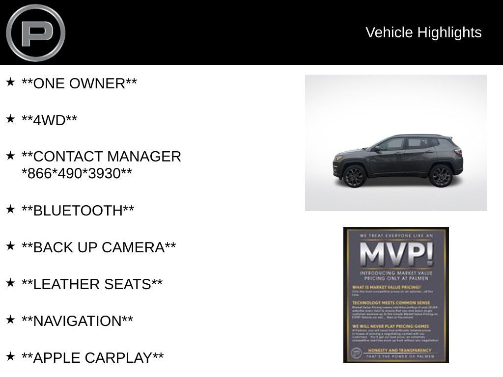 Bring your trade-in and upgrade today—financing available to fit your budget. Visit Palmen Kia and Palmen Motors to test drive this Jeep Compass today!