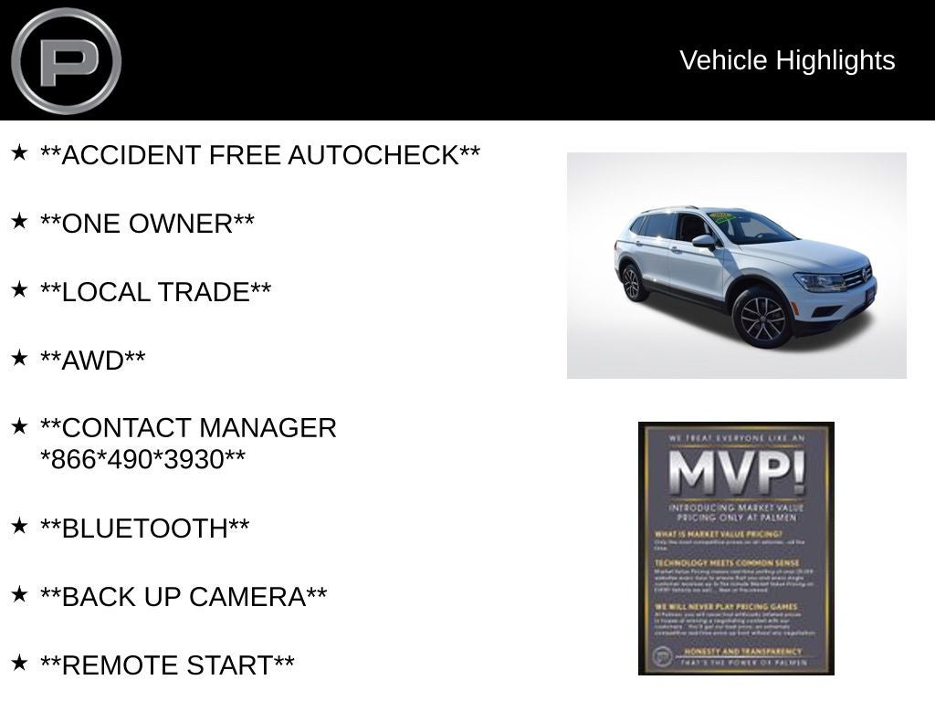 Visit Palmen Kia / Palmen Motors in Kenosha, Wisconsin today to test drive this well-equipped Volkswagen Tiguan and experience comfort, safety, and value in a quality used SUV.