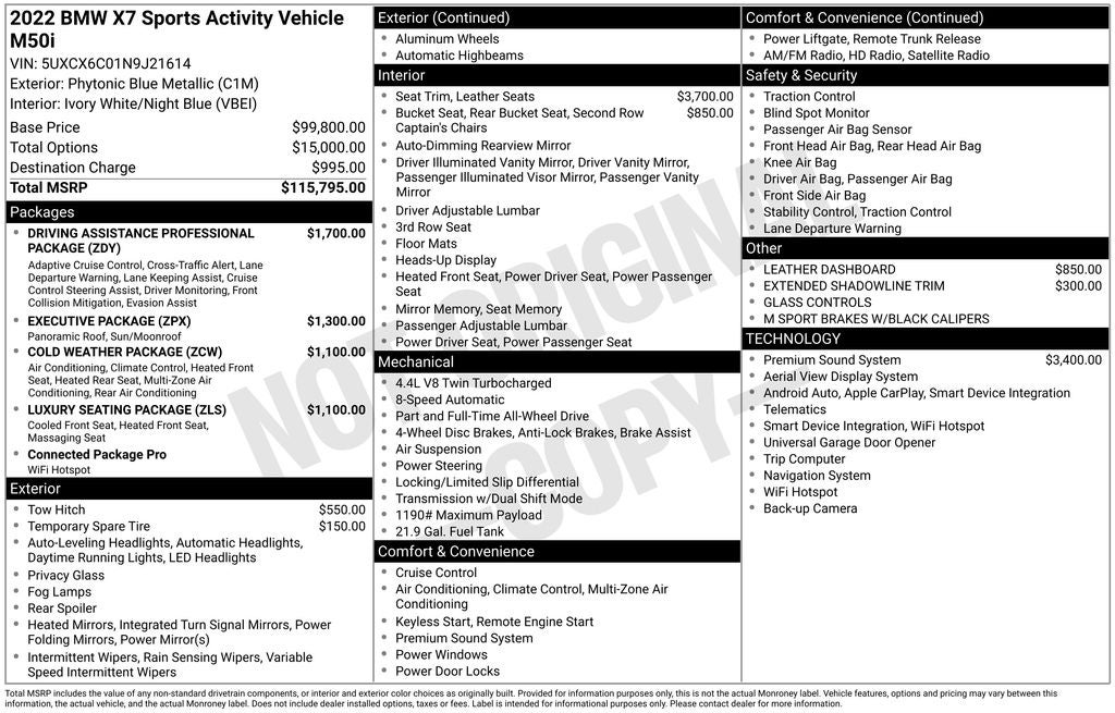 Under the hood is a commanding 4.4L Twin Turbo V8 engine paired with advanced BMW xDrive all-wheel drive, providing smooth yet thrilling performance in all conditions. This X7 M50i is loaded with premium features including the Executive Package, Driving Assistance Professional Package, Luxury Seating Package, Cold Weather Package, and upgraded Bowers & Wilkins premium sound system. Enjoy second-row captain’s chairs, panoramic glass roof, soft-close doors, surround view camera with 3D view, adaptive suspension, and advanced driver-assist technologies.