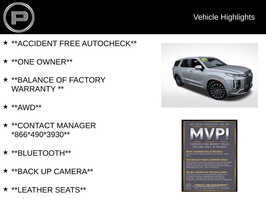 Experience premium comfort and advanced technology in this 2023 Hyundai Palisade Calligraphy AWD, now available at Palmen Kia and Palmen Motors in Kenosha, WI. Finished in elegant Typhoon Silver with a luxurious Black Nappa leather interior, this Palisade is the perfect SUV for families and drivers who want refinement without sacrificing capability.