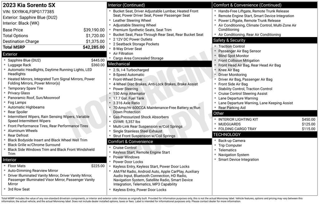 Safety comes standard with Blind-Spot Collision-Avoidance Assist, Forward Collision-Avoidance Assist, Park Distance Warning, and Driver Attention Warning. The Sorentos 20-inch gloss black alloy wheels, LED headlights, and roof rails add to its sporty yet elegant appearance.