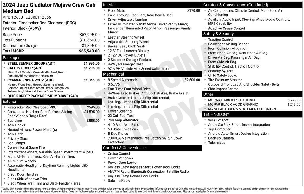 Take on any terrain with confidence in this rugged 2024 Jeep Gladiator Mojave 4x4 now available at Palmen Kia and Palmen Motors in Kenosha, WI. Powered by a strong V6 engine and engineered with Mojave-exclusive off-road enhancements, this Gladiator delivers exceptional capability with Fox suspension, skid plates, Class IV towing equipment, and premium Falken tires. Its bold Firecracker Red exterior, steel bumper group, and 3-piece hardtop give it unmistakable Jeep attitude.
