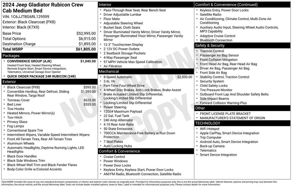 Conquer any terrain with this 2024 Jeep Gladiator Rubicon 4x4 in Black Clearcoat, available now at Palmen Kia and Palmen Motors. Built for serious off-road performance, this Rubicon features a powerful V6 engine, advanced 4x4 system, skid plates, and rugged capability. Equipped with premium upgrades like a hard top, spray-in bedliner, tonneau cover, and modern tech with Uconnect and Alexa built-in.