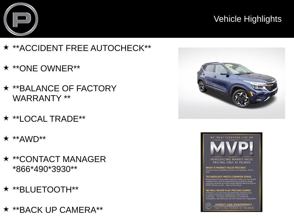 Trade-ins are welcome, and financing is available to fit your budget. Visit Palmen Motors / Palmen Kia in Kenosha, WI today and see why this 2024 Kia Seltos EX AWD stands out on sites like Cars.com and CarGurus.