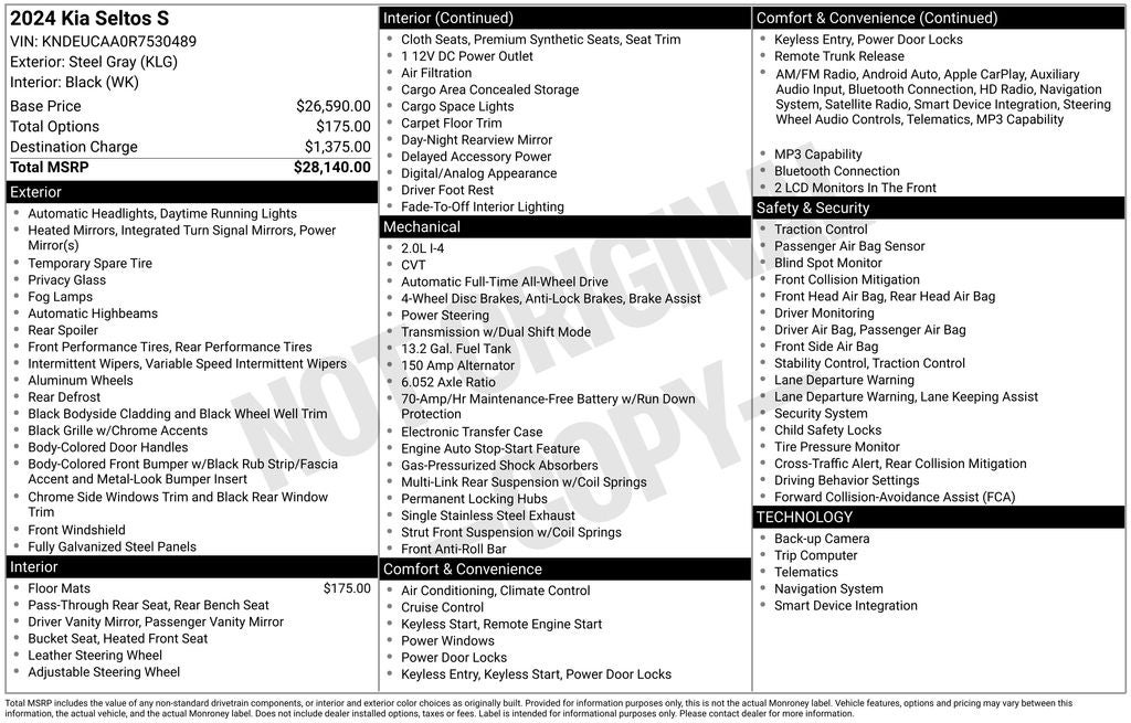 Drive modern style, efficiency, and AWD capability with this 2024 Kia Seltos S AWD, a compact SUV perfect for commuting and everyday versatility across Southeast Wisconsin and Northern Illinois. Powered by a 2.0L 4-cylinder engine paired with an Intelligent Variable Transmission, this Seltos delivers smooth performance and confident all-season traction. Features include a 10.25 touchscreen with navigation, Apple CarPlay & Android Auto, blind-spot collision avoidance, forward collision assist, heated front seats, premium leatherette seating, and stylish 17 alloy wheels. With smart tech and flexible cargo space, it’s ready for daily drives or weekend trips.