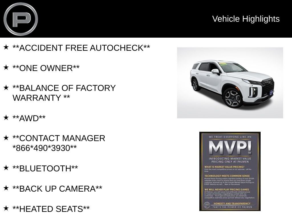 Powered by a smooth 3.8L V6 engine paired with an 8-speed automatic transmission and all-wheel drive, the Palisade delivers confident performance with an EPA-estimated 19 city / 24 highway MPG. Enjoy upscale features including heated and ventilated front seats, H-Tex leatherette seating, power liftgate, 20-inch alloy wheels, panoramic camera system, navigation with real-time traffic, and driver-selectable drive modes.