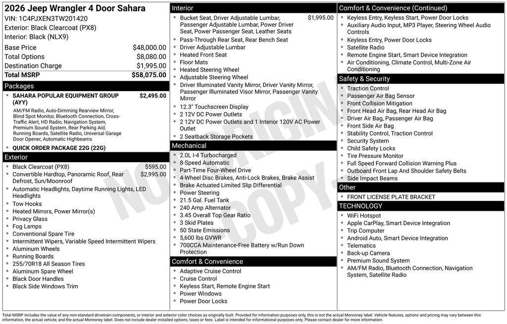This Sahara is loaded with premium features including the Sky One-Touch Power Top, Sahara Popular Equipment Group, dual-zone automatic climate control, ParkView backup camera, forward collision warning, and trailer sway control. Enjoy open-air freedom with removable windows, a full-size spare, skid plates, and rugged suspension built for both city streets and off-road trails. With four doors and a spacious interior, this Wrangler blends versatility with unmistakable Jeep attitude.